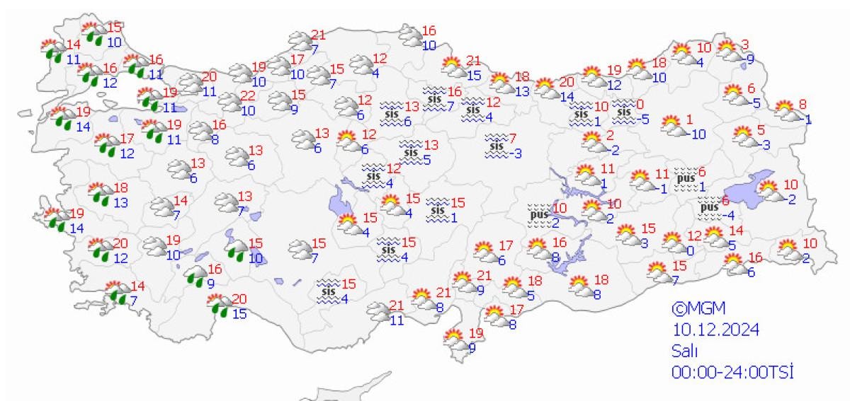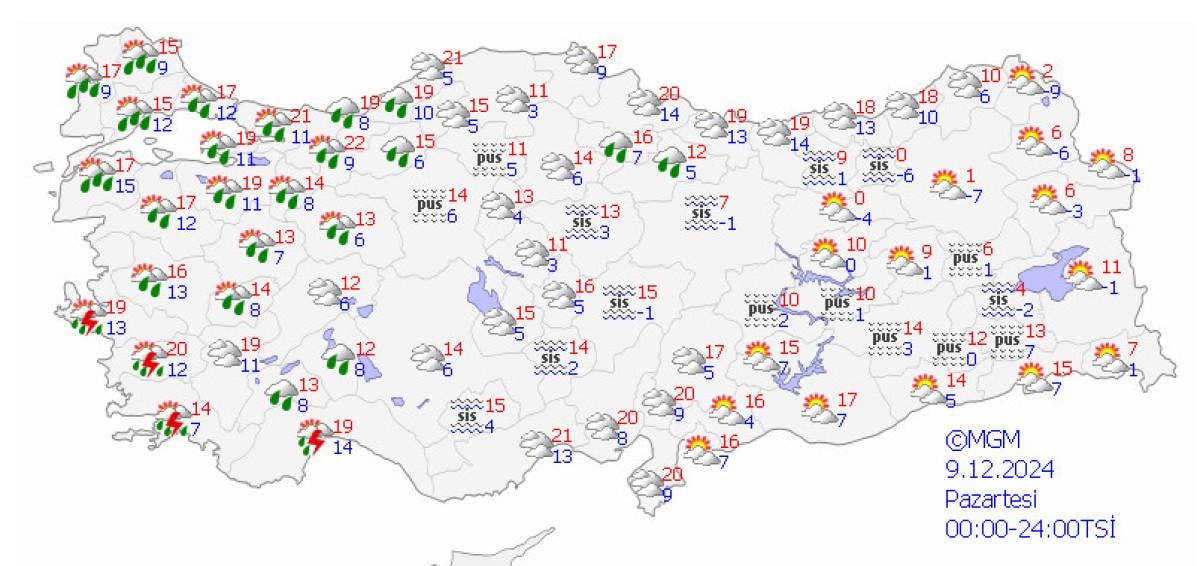 Hava Durumu: Parçalı ve çok bulutlu, batısı yer yer kuvvetli olmak üzere sağanak ve gök gürültülü sağanak yağışlı, Rüzgar: Batı Akdeniz'de güney ve güneydoğudan, batısı güneybatıdan 3 ila 5, bugün gece saatlerine kadar doğusu 6 ila 8; Doğu Akdeniz'de doğu ve kuzeydoğudan 3 ila 5, ilk saatlerde batısı ve Hatay kıyı kesimleri 5 ila 7 kuvvetinde, Dalga: 1,0 ila 2,0 m yer yer 2,5 m, Görüş: İyi, yağış anında orta.