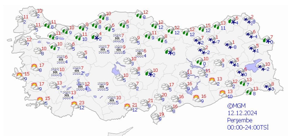 Parçalı ve çok bulutlu, öğle saatlerinden itibaren aralıklı yağmurlu, yüksekleri karla karışık yağmur ve kar yağışlı