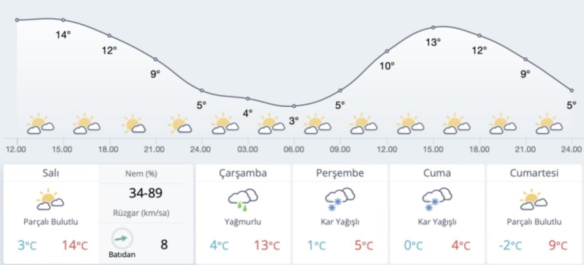 Hafta boyunca günün en yüksek sıcaklık değerleri, Ankara'da 6, Samsun'da 9, İstanbul ve Diyarbakır'da 11, İzmir'de 16, Adana'da 17, Antalya'da 19 derece civarlarına düşecek.