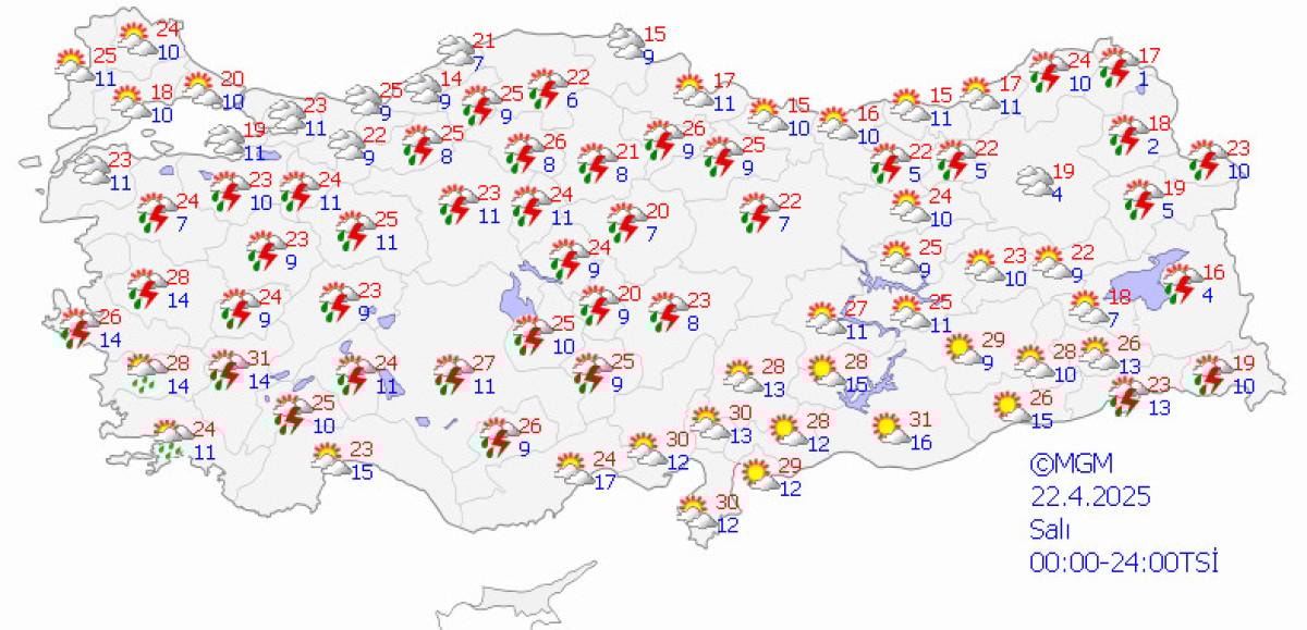 Meteoroloji Genel Müdürlüğü'nün, Türkiye geneli hava durumu tahminleri açıklandı.