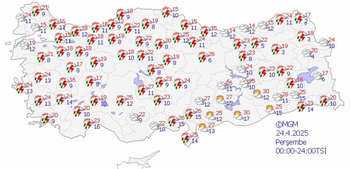 24 Nisan Perşembe günü ise Ege ve Akdeniz'de güneşli hava devam edecek.