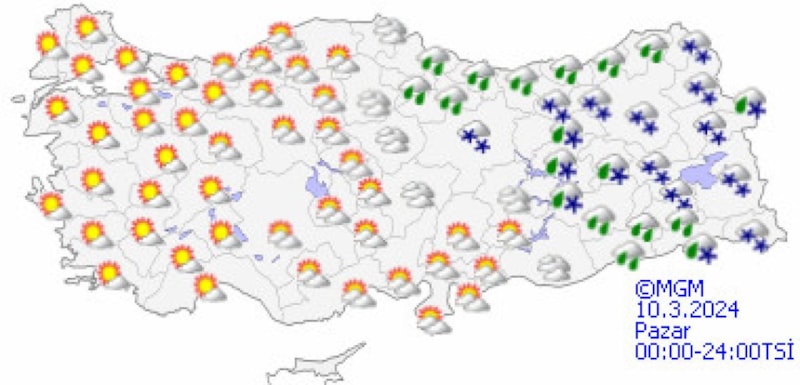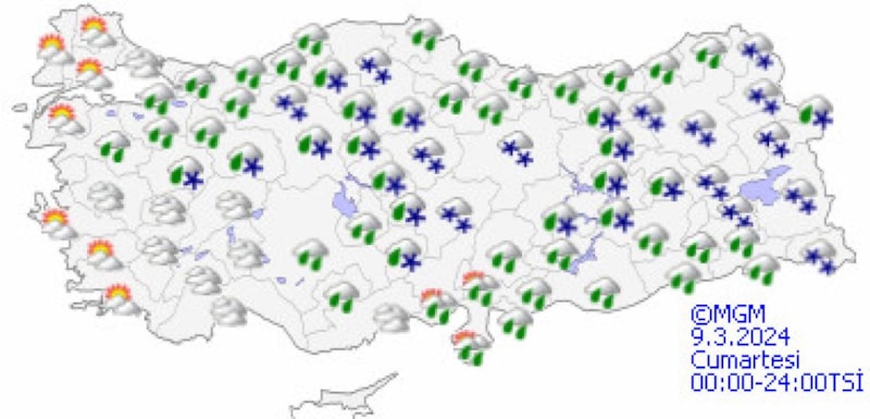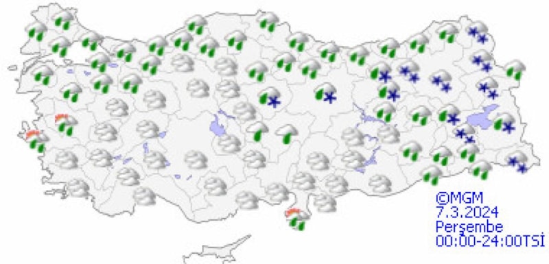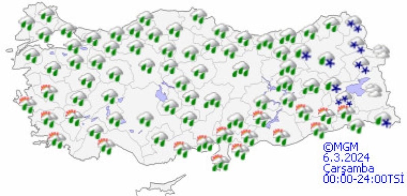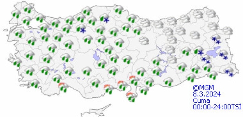 Genellikle yağmur ve sağanak, İç Ege’nin yüksekleri, Doğu Karadeniz’in iç kesimleri ile Doğu Anadolu’nun kuzey ve doğusunun yükseklerinde karla karışık yağmur ve yer yer kar şeklinde görülecek olan yağışların Adana, Osmaniye, Kahramanmaraş, Kayseri, Sivas, Giresun, Trabzon, Rize, Erzincan, Tunceli, Bingöl, Muş, Bitlis ve Hakkari çevrelerinde yerel kuvvetli olması bekleniyor.