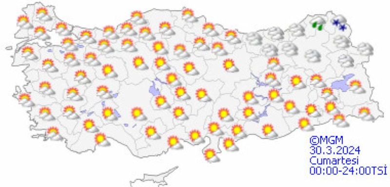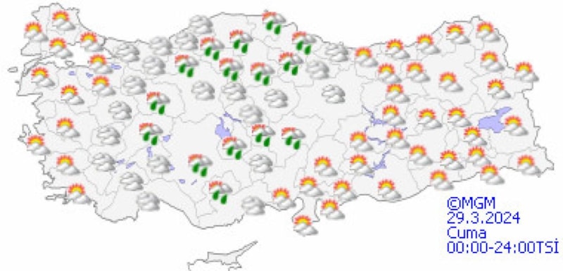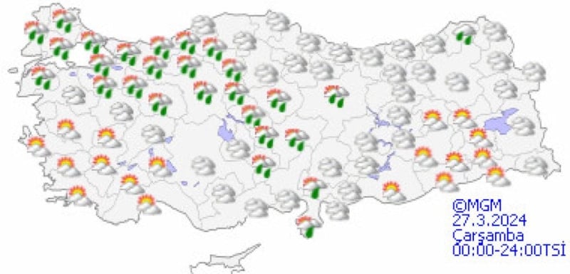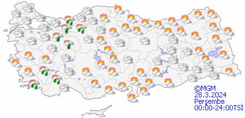 Meteoroloji Genel Müdürlüğü'nden alınan tahminlere göre; yurdun genelinin parçalı ve çok bulutlu, Marmara'nın kuzeyi, Batı Karadeniz'in batısı, İç Anadolu'nun kuzeyi, Güneydoğu Anadolu'nun batısı, Bilecik, Kayseri, Aksaray, Niğde, Osmaniye, Kahramanmaraş, Mardin, İzmir'in kuzey, Manisa'nın doğu, Balıkesir'in güney kesimleri, Adana'nın güney ve doğu kesimleri ile Diyarbakır ve Batman'ın güney çevrelerinin yağışlı geçeceği tahmin ediliyor.