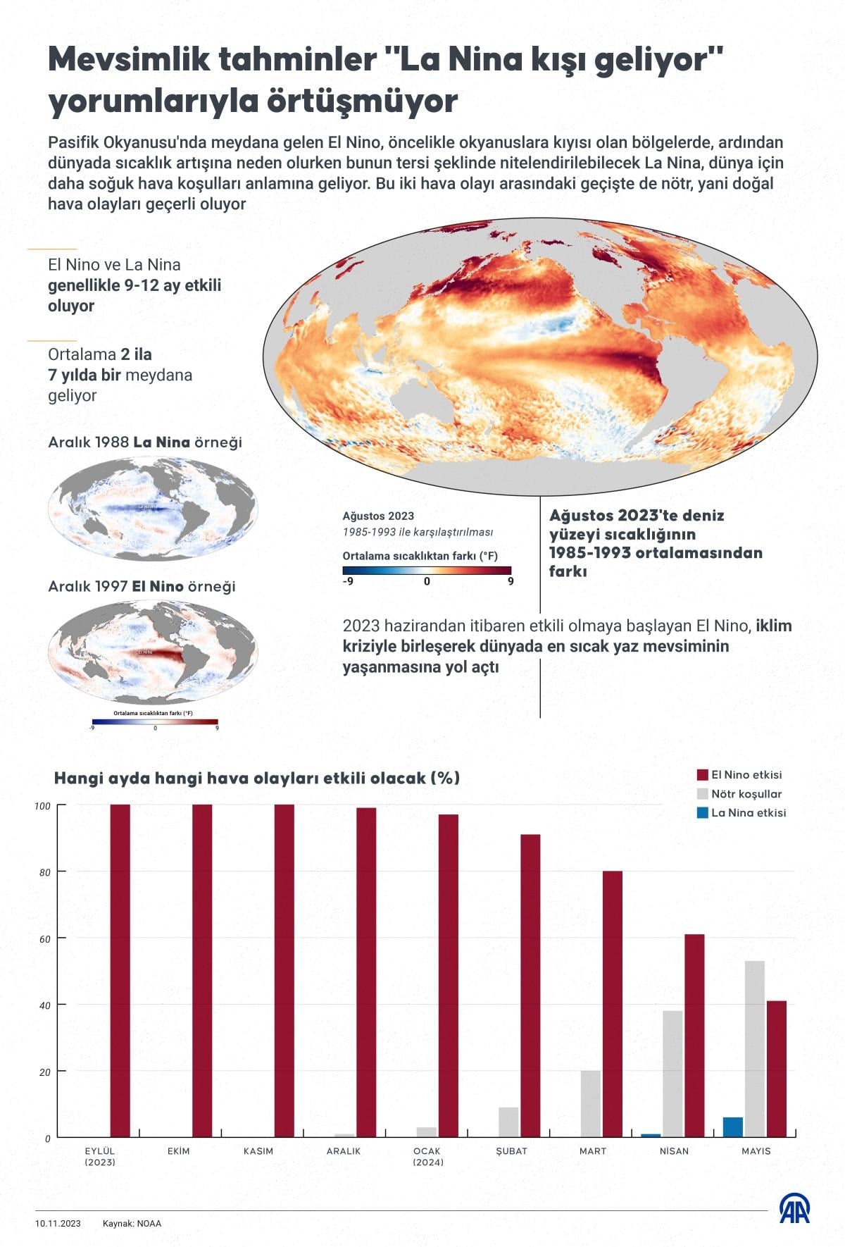 Aralıktan itibaren etkisi azalmaya başlayacak olsa da mayıs ayında dahi El Nino'nun yüzde 41, nötr koşulların yüzde 53, La Nina'nın ise yüzde 6 etkili olacağı tahmin ediliyor.
