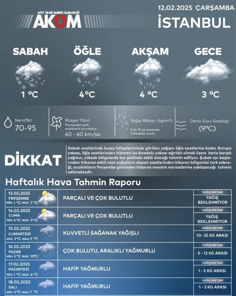 Çatalca, Silivri, Başakşehir, Esenyurt, Arnavutköy, Eyüp ve Sultangazi’de yağışların kar geçişleri şeklinde olması, zaman zaman kar yağışının kuvvetlenmesi bekleniyor.