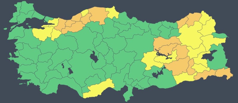 Artvin, Batman, Bingöl, Bolu, Diyarbakır, Düzce, Erzincan, Hakkari, Karabük, Kastamonu, Rize, Sakarya, Şırnak, Tunceli ve Zonguldak turuncu uyarı verilen iller olarak sıralanırken Ağrı, Ardahan, Bartın, Bilecik, Bitlis, Bursa, Elazığ, Erzurum, Kars, Kocaeli, Malatya, Mardin, Mersin, Muş, Siirt, Sinop ve Yalova'ya ise sarı uyarı verildi.