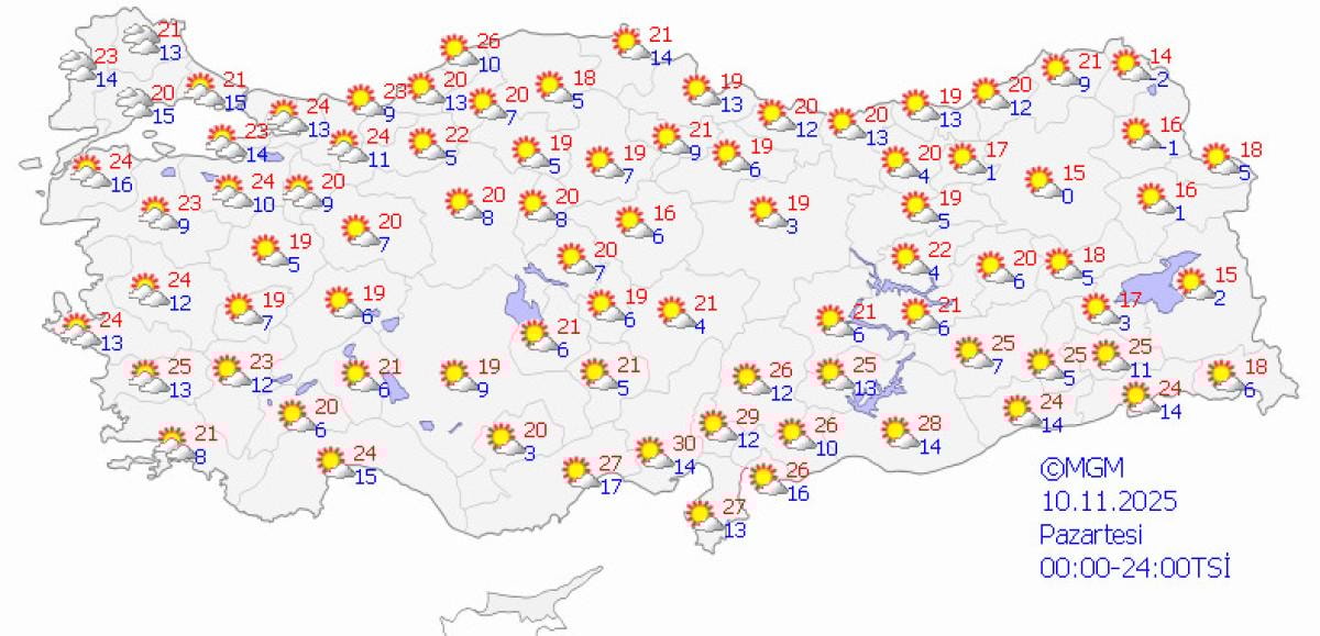 Bazı illerde beklenen hava durumuyla günün en yüksek sıcaklıkları şöyle: