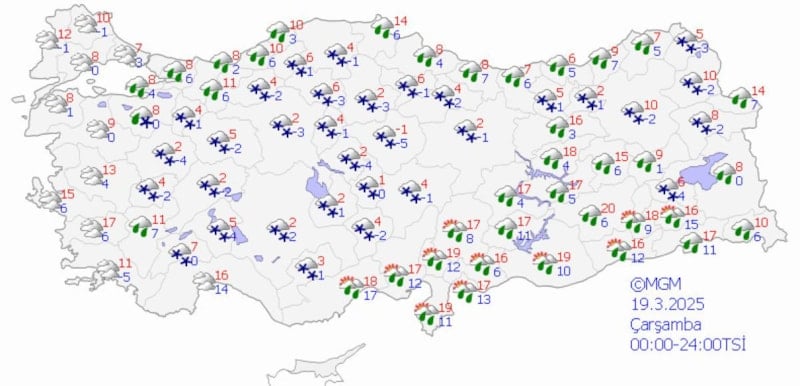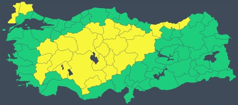 Afyonkarahisar, Amasya, Ankara, Çankırı, Çorum, Denizli, Edirne, Eskişehir, Giresun, Isparta, Kayseri, Kırklareli, Kırşehir, Konya, Kütahya, Nevşehir, Niğde, Rize, Sivas, Tokat, Trabzon, Uşak, Yozgat, Aksaray, Karaman ve Kırıkkale, sarı uyarı verilen iller olarak sıralandı.