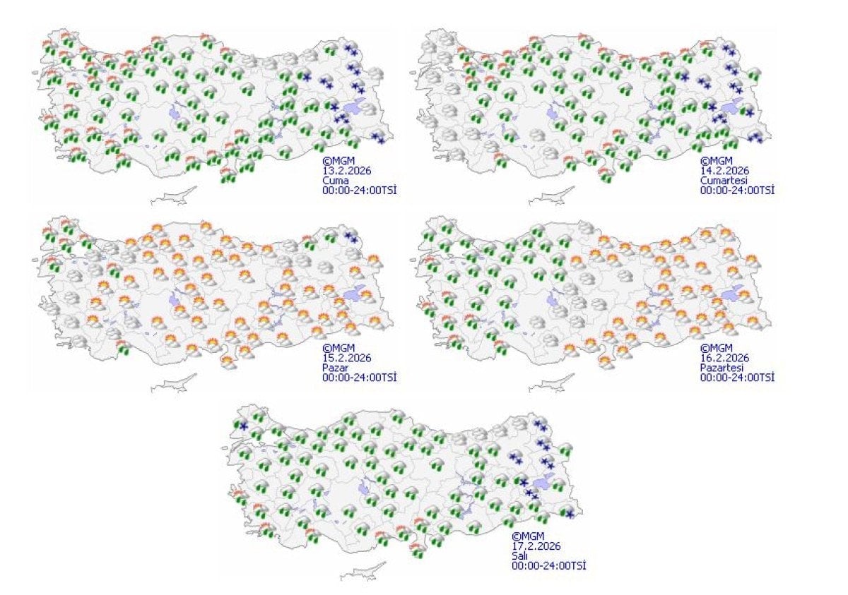 Meteoroloji Genel Müdürlüğü’nün 13-17 Şubat 2026 tarihlerini kapsayan tahmin haritasına göre Türkiye genelinde yağışlı hava etkili olacak. Özellikle hafta sonu ve yeni haftanın ilk günlerinde birçok bölgede sağanak görülürken, Doğu Anadolu’da kar yağışı dikkat çekiyor.
