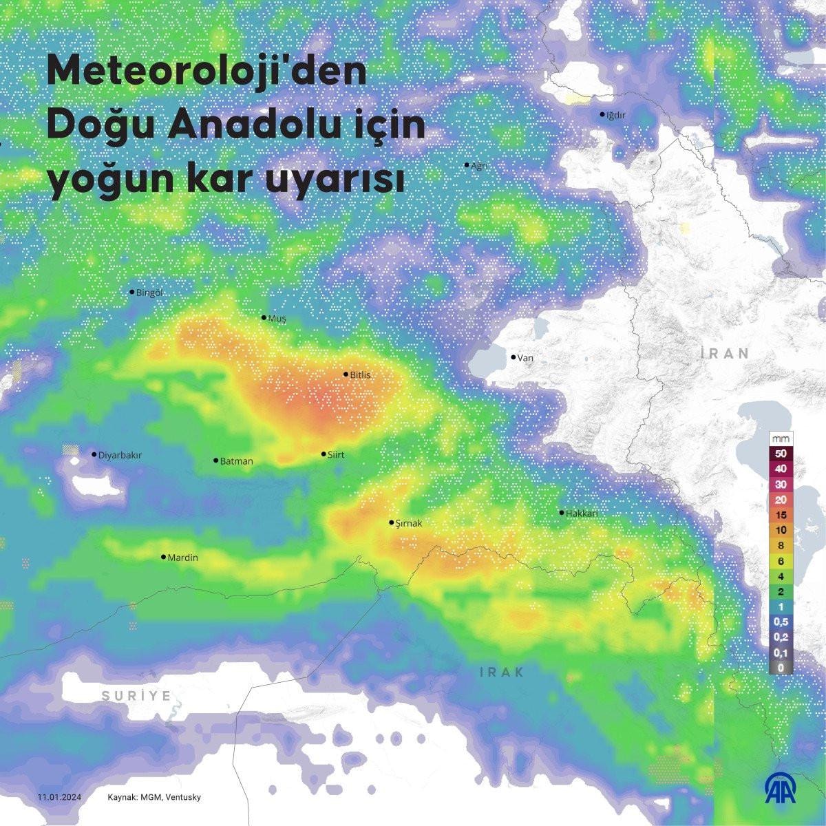 Meteoroloji Genel Müdürlüğü'nden yapılan açıklamaya göre cuma günü akşam saatlerinden itibaren Van ve Ağrı çevreleri ile Muş'un güneyi ve Siirt'in doğusunda kuvvetli kar, Bitlis, Hakkari çevreleri ile Van'ın güneyi ve Şırnak'ın doğusunda ise yoğun kar bekleniyor.