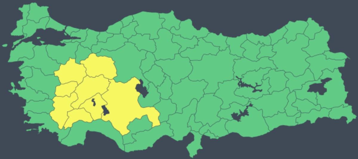 Öte yandan kuvvetli yağış beklenen, Afyonkarahisar, Burdur, Denizli, Eskişehir, Isparta, Konya, Kütahya ve Uşak için "sarı" kodlu uyarıda bulunuldu.