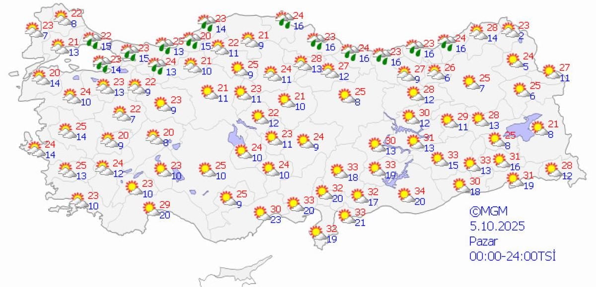 Yayınlanan haftalık (3 - 9 Ekim 2025) hava tahmininde, hava sıcaklıklarının iç ve batı bölgelerde mevsim normalleri civarında, doğu kesimlerde mevsim normalleri üzerinde seyretmesinin beklendiği kaydedildi.