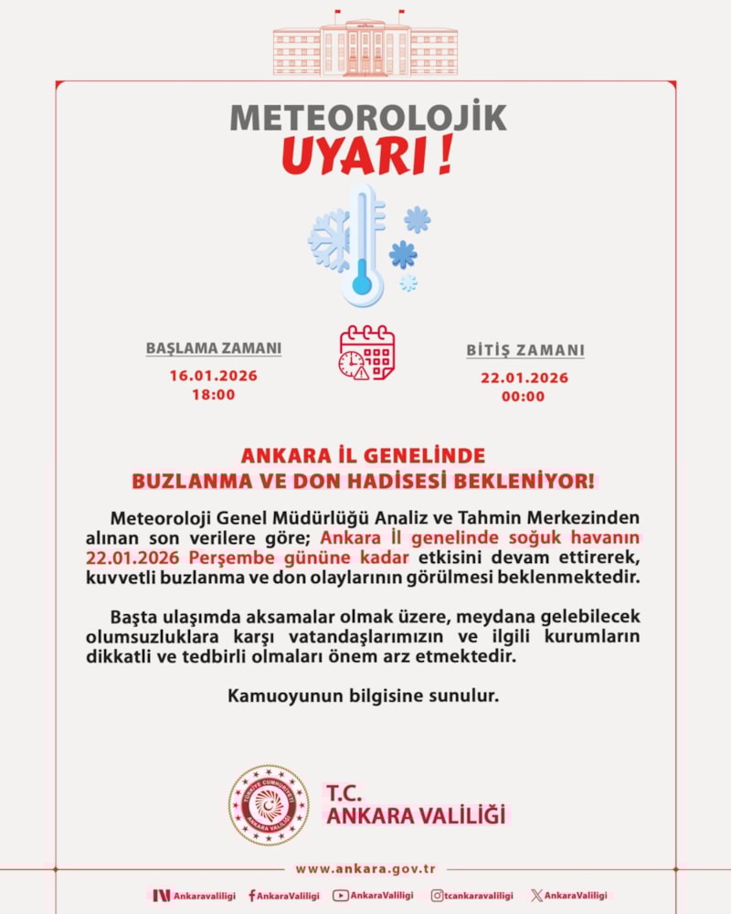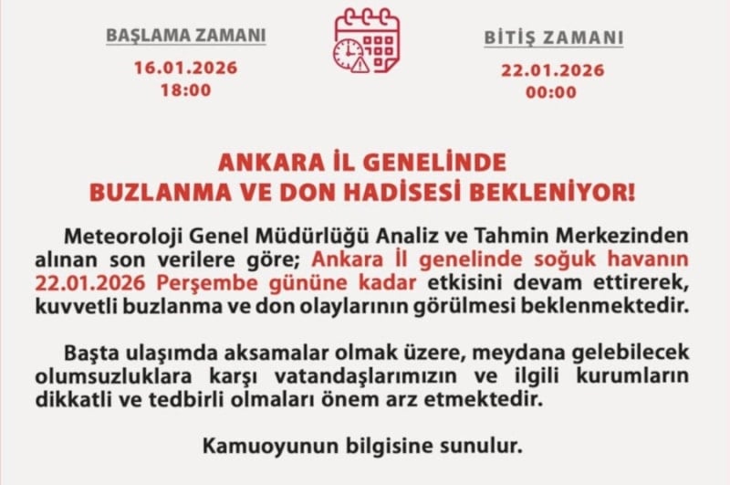 Ankara Valiliği, Meteoroloji Genel Müdürlüğü Analiz ve Tahmin Merkezi’nden alınan son verilere dayanarak kent genelinde kuvvetli buzlanma ve don olayları beklendiğini duyurdu.