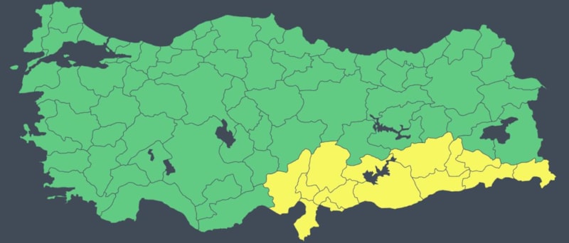Sarı uyarı verilen iller Adana, Adıyaman, Batman, Diyarbakır, Gaziantep, Hakkari, Hatay, Kahramanmaraş, Kilis, Mardin, Osmaniye, Siirt, Şanlıurfa ve Şırnak olarak sıralandı.