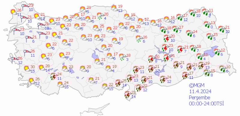 Meteoroloji Genel Müdürlüğü'nden yapılan açıklamada, "Aralıklı ve yerel olarak kuvvetli sağanak ve gök gürültülü sağanak yağış beklendiğinden sel, su baskını, ulaşımda aksamalar, yıldırım, dolu yağışı, yağış anından kuvvetli rüzgar gibi olumsuzluklara karşı dikkatli ve tedbirli olunmalıdır" denildi.