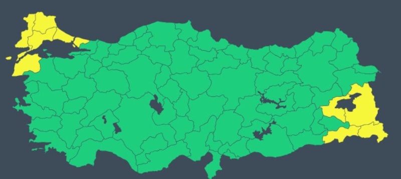 Bitlis, Çanakkale, Edirne, Hakkari, İstanbul, Kırklareli, Tekirdağ, Van, Şırnak" dahil 9 kentte sarı alarm verildi.