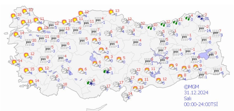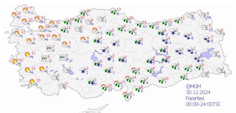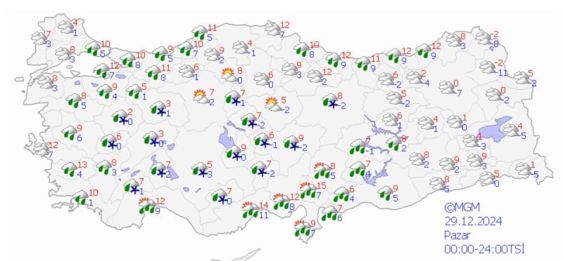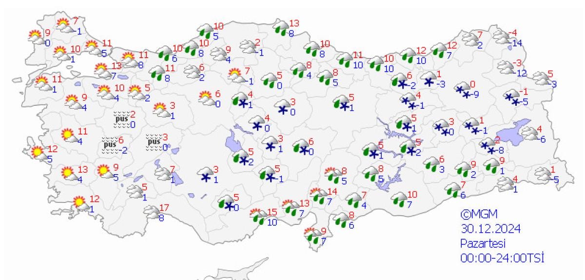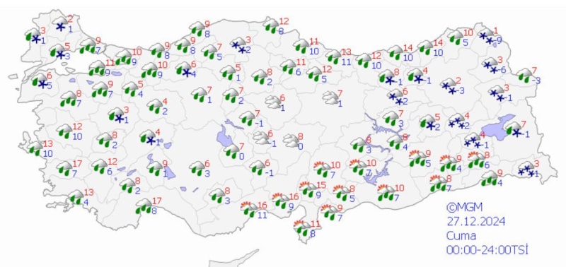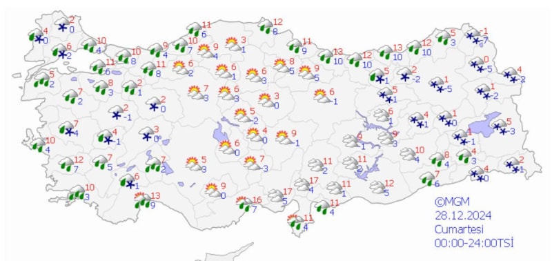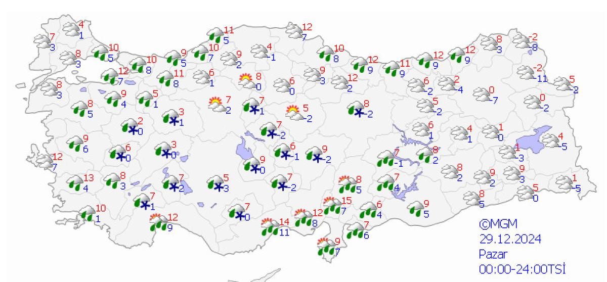 “Bugün Marmara, Akdeniz, Doğu Anadolu, Batı Karadeniz, Güneydoğu Anadolu yağmurlu. Antalya çevreleri, Doğu Akdeniz'in batısı ile Kırklareli çevrelerinde kuvvetli yağmur, zamanla Kırklareli'nin yüksekleri ile Akdeniz'in yükseklerinde karla karışık yağmur ve kar yağışı, rüzgar Marmara’da kuzeydoğudan kuvvetli.