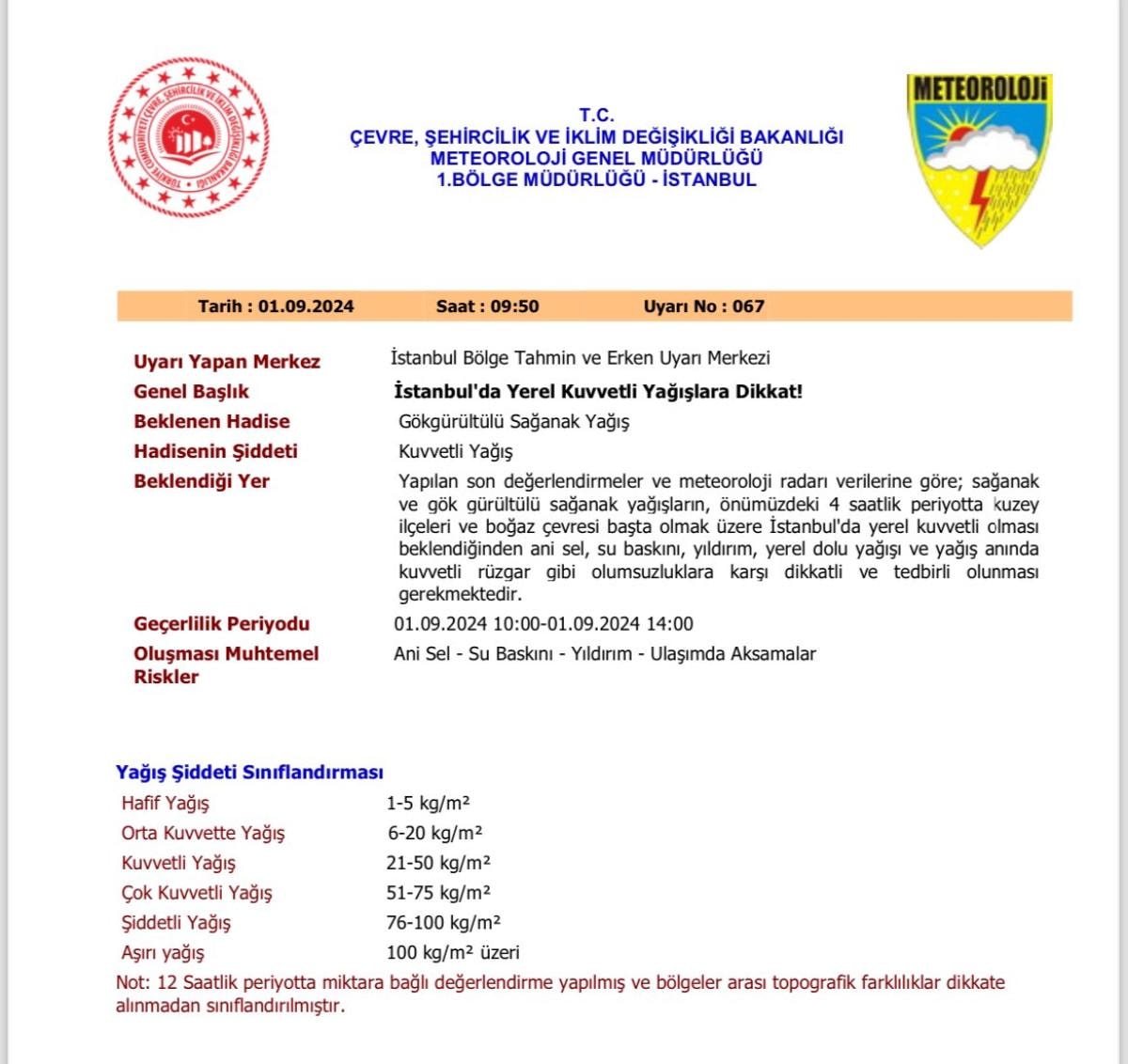 Yağışların, bölge genelinde yer yer kuvvetli olması beklendiğinden ani sel, su baskını, yıldırım, yerel dolu yağışı ve yağış anında kuvvetli rüzgar gibi olumsuzluklara karşı dikkatli tedbirli olunması gerekmektedir.