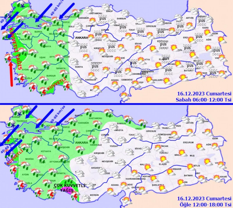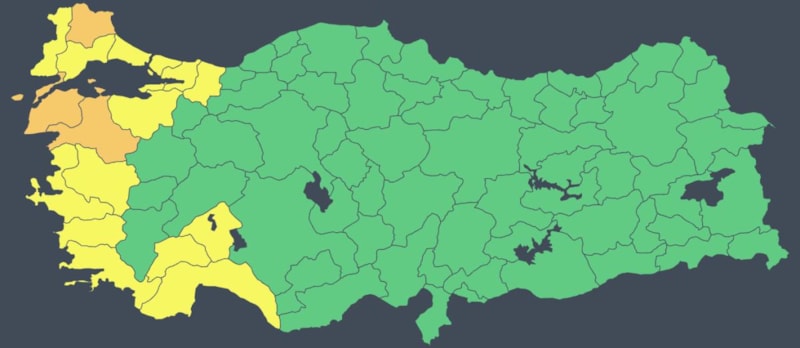 Balıkesir, Çanakkale ve Kırklareli turuncu uyarı verilen iller olarak sıralanırken Antalya, Aydın, Burdur, Bursa, Edirne, Isparta, İstanbul, İzmir, Kocaeli, Manisa, Muğla, Sakarya, Tekirdağ ve Yalova'ya ise sarı uyarı verildi.