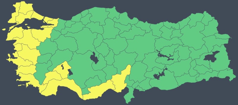 Sarı uyarı verilen iller Adana, Antalya, Aydın, Balıkesir, Burdur, Bursa, Çanakkale, Edirne, Isparta, Mersin, İstanbul, İzmir, Kırklareli, Kocaeli, Manisa, Muğla, Tekirdağ, Yalova olarak sıralandı.