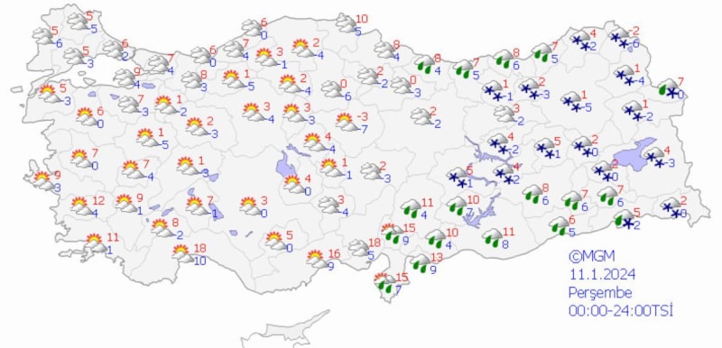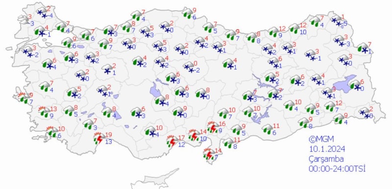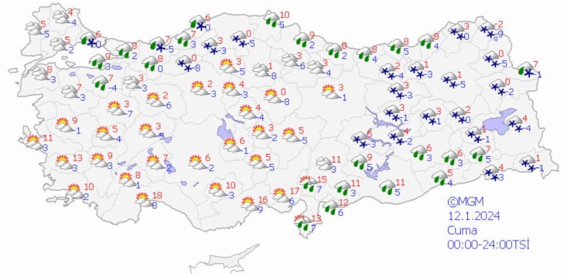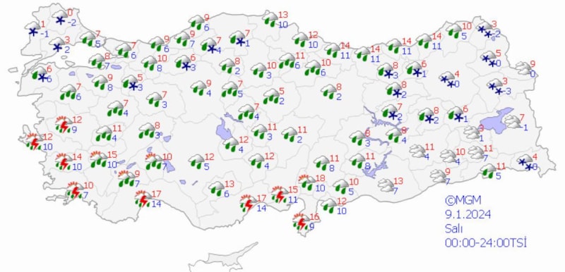 Yurdun batı kesimlerinde görülecek yağışlar Muğla çevreleri, İzmir ve Manisa'nın kuzey ve batı, Balıkesir'in güney ve batısı ile Aydın'ın kıyı ilçelerinde kuvvetli, Muğla'nın kıyı kesimlerinde yer yer çok kuvvetli olacak, yağışlar akşam saatlerinden sonra sıcaklıkların düşmesiyle birlikte Manisa ve Balıkesir'in yüksek kesimlerinde karla karışık yağmur ve kar şeklinde görülecek.