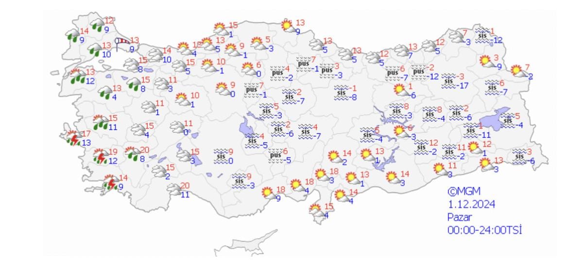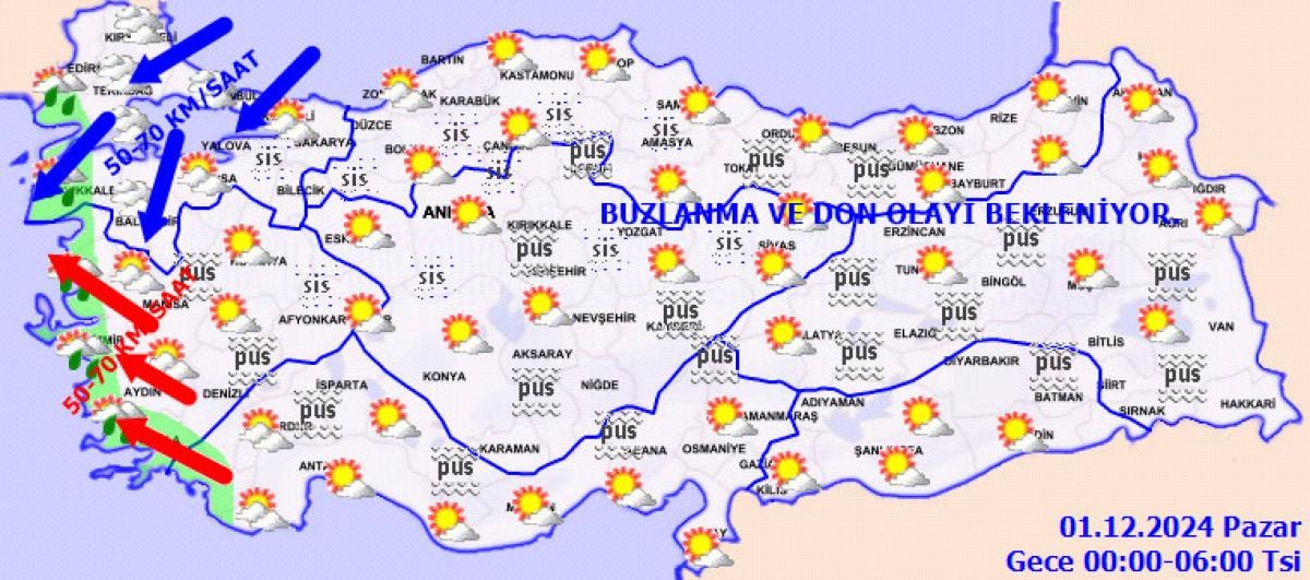 Parçalı ve az bulutlu geçeceği tahmin ediliyor. İç ve yüksek kesimlerde pus ve yer yer sis ile birlikte buzlanma ve don bekleniyor.