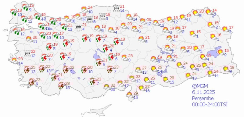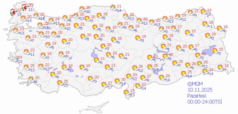 Meteoroloji verilerine göre; Marmara'nın batısı, İç Ege, Batı Akdeniz, İç Anadolu’nun batısında sağanak ve gök gürültülü sağanak yağış etkili olacak.