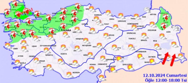 Hava durumunun parçalı yer yer çok bulutlu, Marmara, Batı ve Orta Karadeniz ile Eskişehir, Çankırı, Giresun, Kars, Ardahan çevreleri ile Kütahya ve Ankara’nın kuzey kesimlerinin sağanak ve gök gürültülü sağanak yağışlı geçeceği tahmin ediliyor.