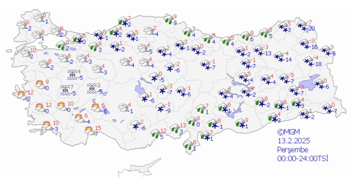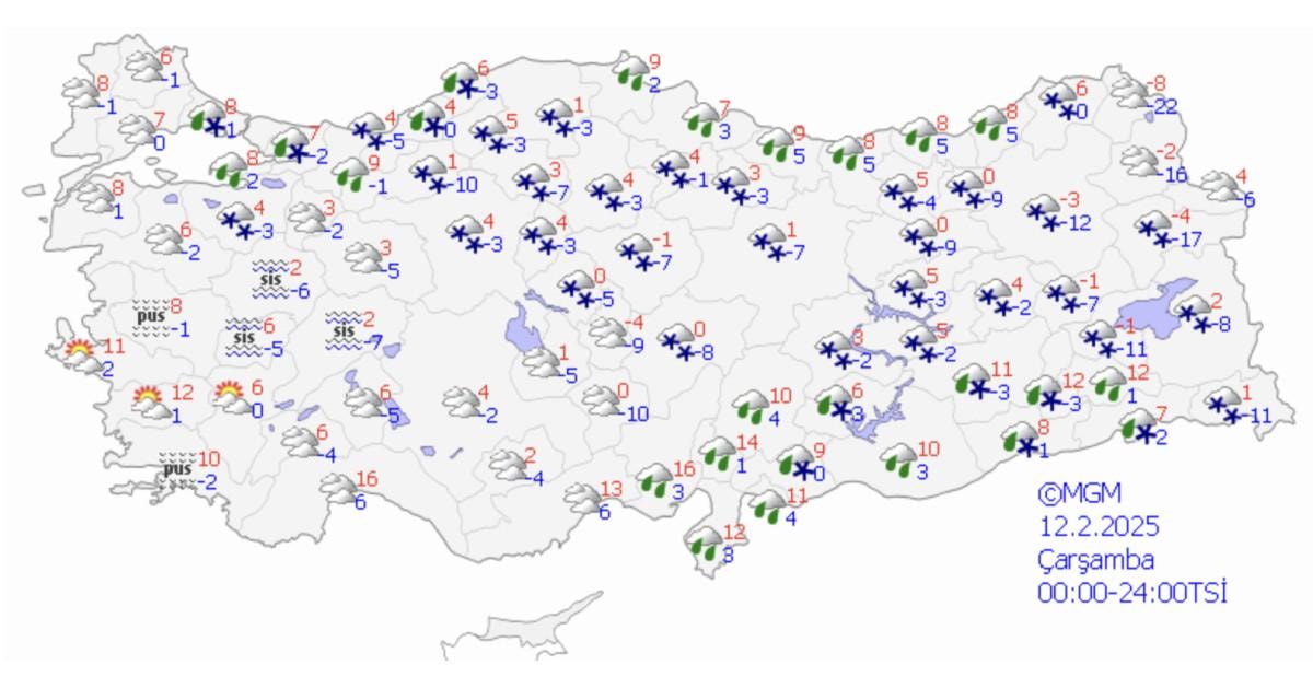Çok bulutlu, kıyı kesimleri aralıklı yağmurlu, iç kesimleri karla karışık yağmur ve kar yağışlı