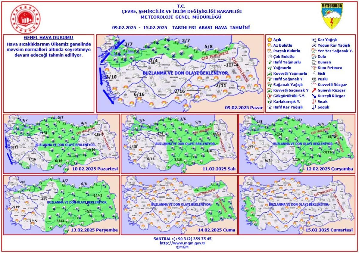 Doğu Karadeniz’in iç kesimlerinin yüksekleri ile Doğu Anadolu'nun doğusunun dik ve eğimli yamaçlarında çığ tehlikesi ile yurdun iç ve doğu kesimlerinde yer yer kuvvetli olmak üzere buzlanma ve don olayı beklendiğinden meydana gelebilecek olumsuzluklara karşı dikkatli ve tedbirli olunması gerekmektedir.
