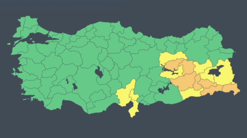 Gökgürültülü ve kuvvetli yağış beklenen Adana, Bitlis, Elazığ, Erzincan, Hatay, Mardin, Muş, Van, Osmaniye için 'sarı', Bingöl, Diyarbakır, Hakkari, Siirt, Tunceli, Batman ve Şırnak için 'turuncu' kodlu uyarıda bulunuldu.