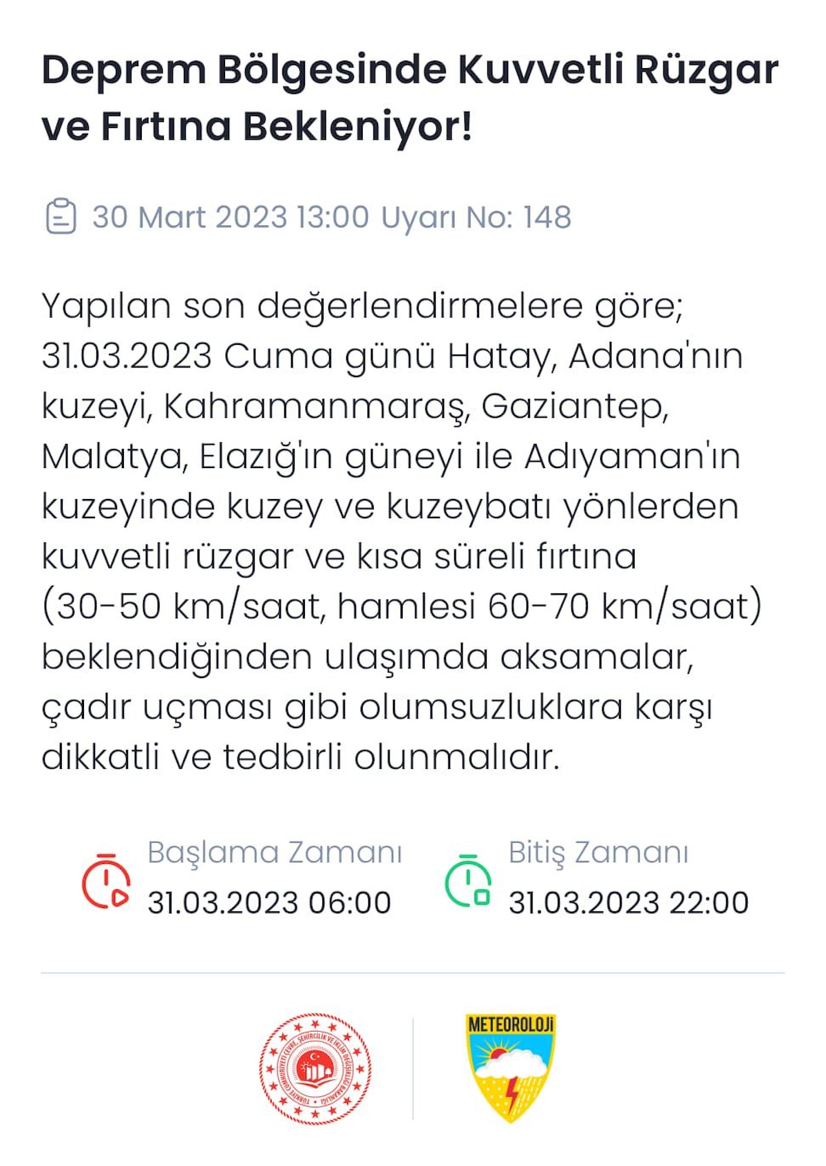 Yapılan son değerlendirmelere göre; 31.03.2023 Cuma günü Hatay, Adana'nın kuzeyi, Kahramanmaraş, Gaziantep, Malatya, Elazığ'ın güneyi ile Adıyaman'ın kuzeyinde kuzey ve kuzeybatı yönlerden kuvvetli rüzgar ve kısa süreli fırtına beklendiğinden ulaşımda aksamalar, çadır uçması gibi olumsuzluklara karşı dikkatli ve tedbirli olunmalıdır.