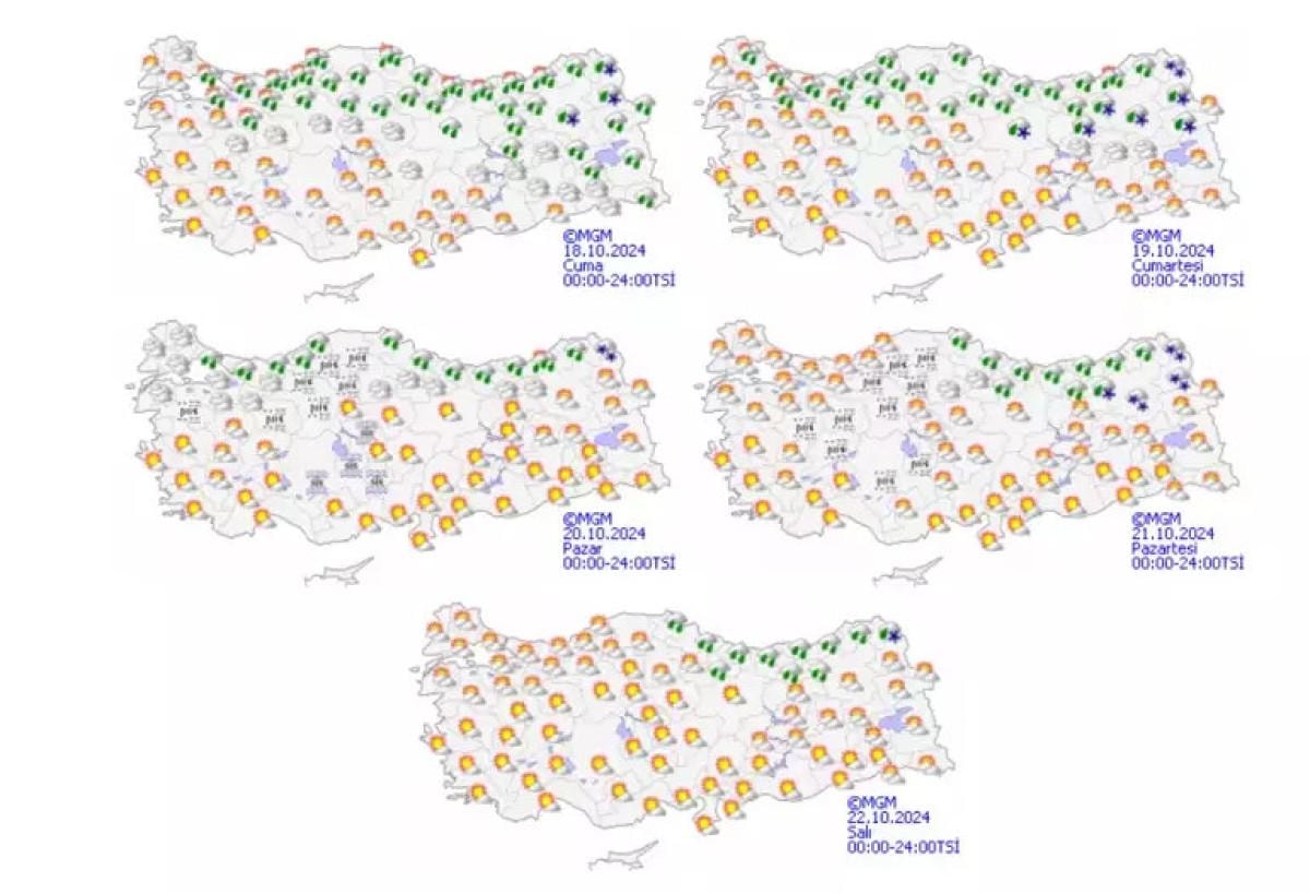 Meteoroloji Genel Müdürlüğü tarafından yapılan son tahminlere göre: Ülkemiz genelinin parçalı, yer yer çok bulutlu, Marmara’nın doğusu, Karadeniz, Doğu Anadolu’nun kuzey ve doğusu, Güney Doğu Anadolu'nun doğusu ile Yozgat, Sivas ve Çankırı çevrelerinin yağmur ve sağanak yağışlı, Karadeniz’in iç kesimlerinin yüksekleri ile Doğu Anadolu’nun doğusunun yükseklerinin karla karışık yağmur ve kar yağışlı geçeceği tahmin ediliyor. Yağışların Karadeniz kıyıları, Bitlis, Muş, Van'ın kuzeybatısı, Diyarbakır, Siirt'in kuzeyi, Ağrı ile Iğdır'da yer yer kuvvetli olması bekleniyor. Rüzgarın Ege kıyıları, Marmara ve Akdeniz’in iç kesimlerinde kuzeyli yönlerden kuvvetli (40-60 km/sa) olarak eseceği tahmin ediliyor. Gece ve sabah saatlerinde iç kesimlerde yer yer hafif zirai don olayı bekleniyor.