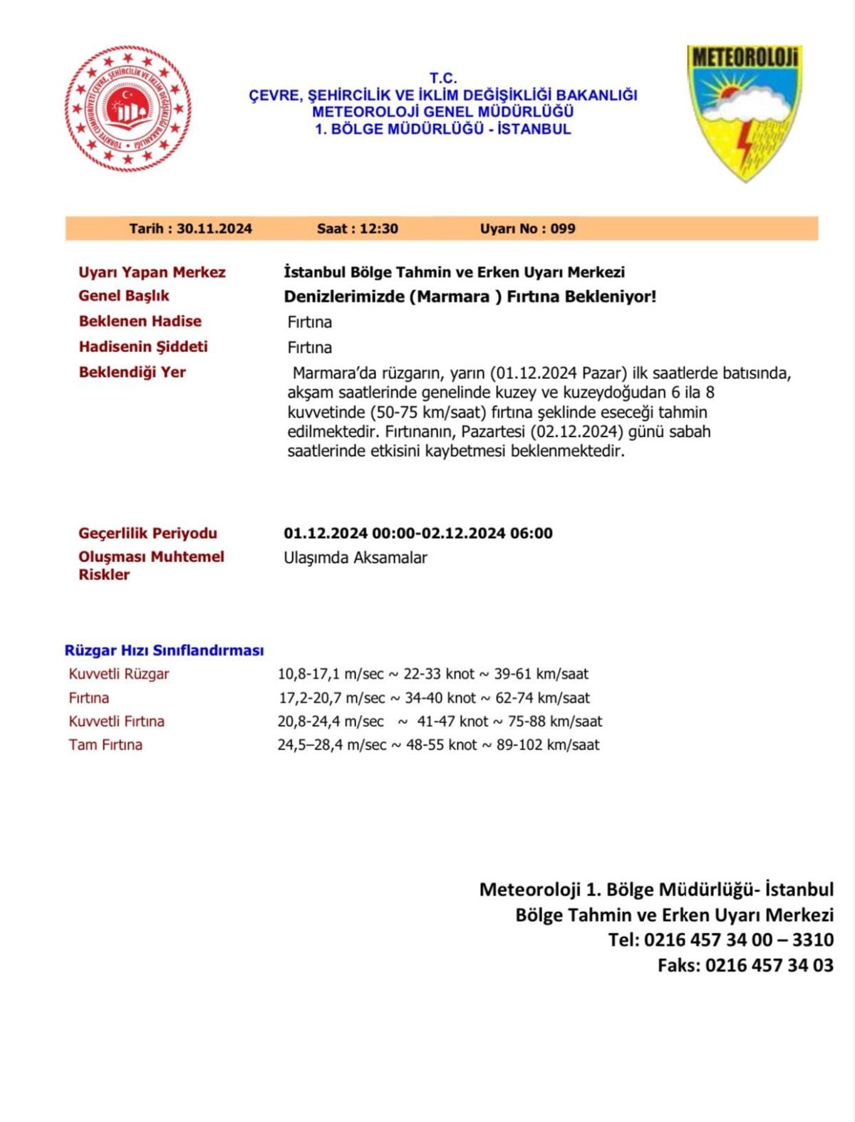 Meteoroloji’ye göre; Marmara’da rüzgarın, yarın (01.12.2024 Pazar) ilk saatlerde batısında, akşam saatlerinde genelinde kuzey ve kuzeydoğudan 6 ila 8 kuvvetinde (50-75 km/saat) fırtına şeklinde eseceği tahmin edilmektedir.
