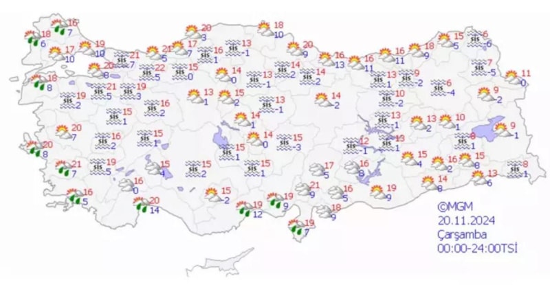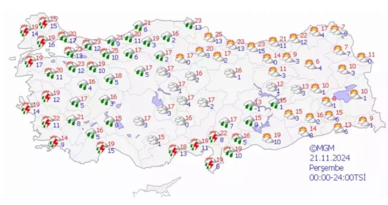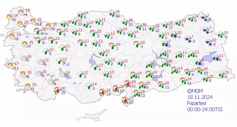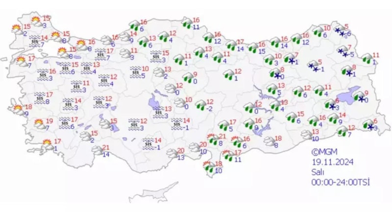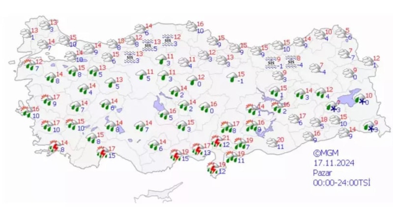 Meteoroloji Genel Müdürlüğü tarafından yapılan son tahminlere göre: Ülkemiz genelinin parçalı ve çok bulutlu, Marmara’nın güneyi, Ege, Akdeniz, İç Anadolu, Orta ve Doğu Karadeniz kıyıları, Doğu Anadolu (Erzincan ve Şırnak haric), Güneydoğu Anadolu’nun kuzey ve batısı ile Artvin çevrelerinin yağmur ve sağanak yağışlı, Doğu Anadolu’nun güneydoğusunun yükseklerinin karla karışık yağmur ve kar yağışlı geçeceği tahmin ediliyor. Yağışların; Kıyı Ege, Batı Akdeniz kıyıları ile Doğu Akdeniz ile Gaziantep, Kilis, Artvin ve Rize çevrelerinde yerel kuvvetli olması bekleniyor. Gece ve sabah saatlerinde kuzey ve doğu kesimlerde pus ve yer yer sis bekleniyor.