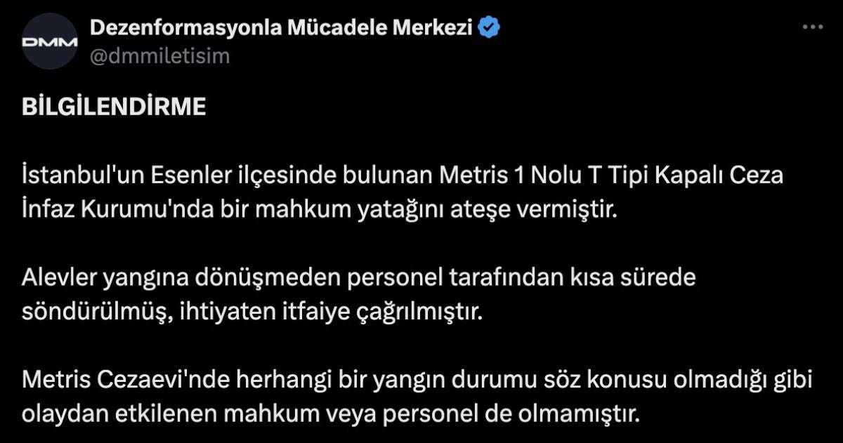 Metris Cezaevi'nde herhangi bir yangın durumu söz konusu olmadığı gibi olaydan etkilenen mahkum veya personel de olmamıştır.