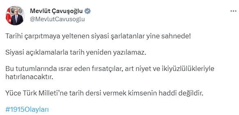 1915 olayları konusunda gerçeklerle ve uluslararası hukukla bağdaşmayan talihsiz açıklamalar, tarihi siyasi saiklerle yeniden yazmaya yeltenen beyhude çabalardır. Hiç kimse unutmamalıdır ki 1915 olayları siyasetçilerin kendi gündemlerine ve iç siyasi mülahazalarına göre tanımlanamaz. Böyle bir yaklaşım, ancak tarihin tahrif edilmesine yol açar. Bu taraflı tutumlarını sürdürmekte ısrar edenler, tarihte ucuz siyasi fırsatçılar olarak anılacaktır. Bizim açımızdan hükümsüz olan bu açıklamaları reddediyor, bu yanlışta ısrar edenleri en şiddetli şekilde kınıyoruz.