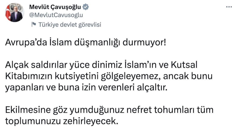 Çavuşoğlu sosyal medya hesabı üzerinden yaptığı açıklamada, Avrupa'da İslam düşmanlığının durmadığını söyledi.