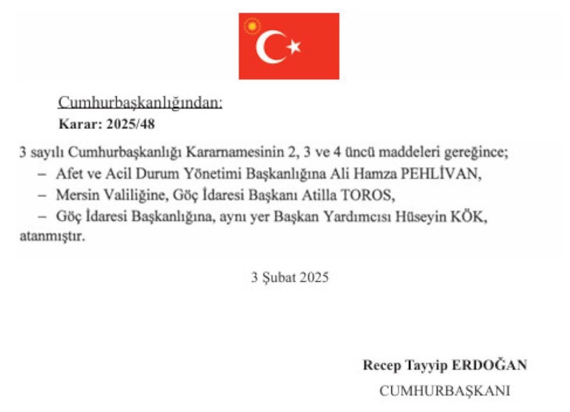 AFAD Başkanlığı'na ise Mersin Valisi Ali Hamza Pehlivan atanırken, Göç İdaresi Başkanı Atilla Toros da Mersin Valiliği'ne atandı..