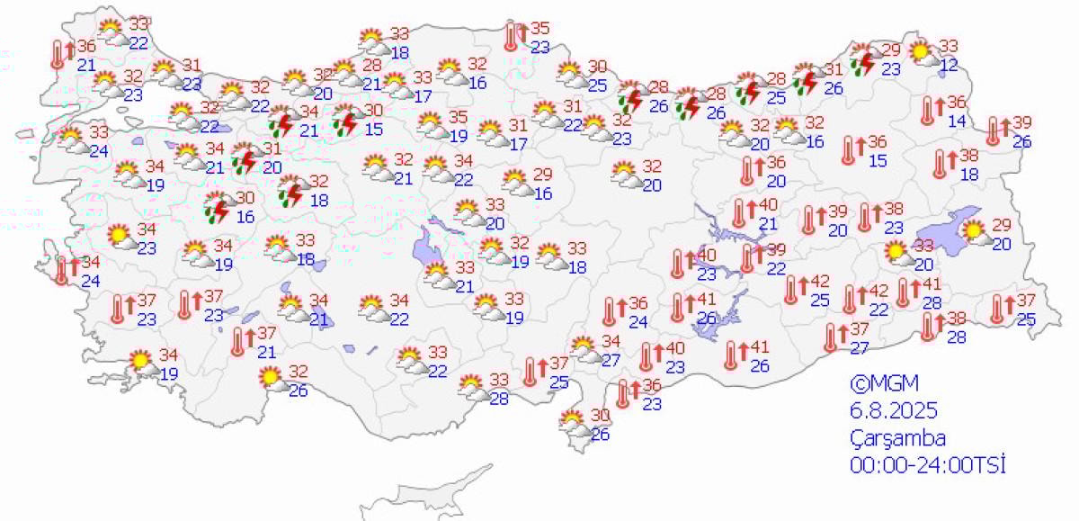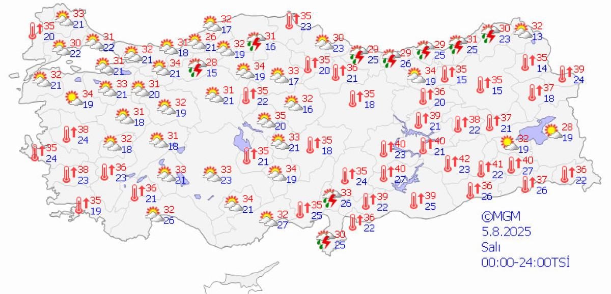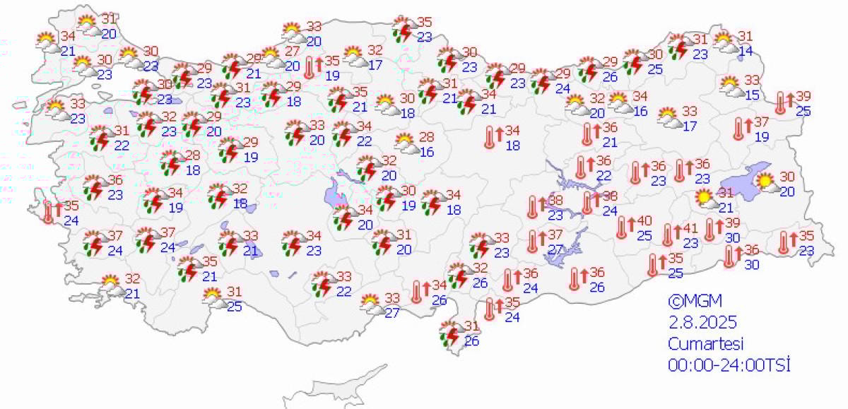 İzmir: 35 derece, az bulutlu ve açık, zaman zaman parçalı bulutlu, iç kesimleri yerel sağanak ve gök gürültülü sağanak yağışlı olacak.