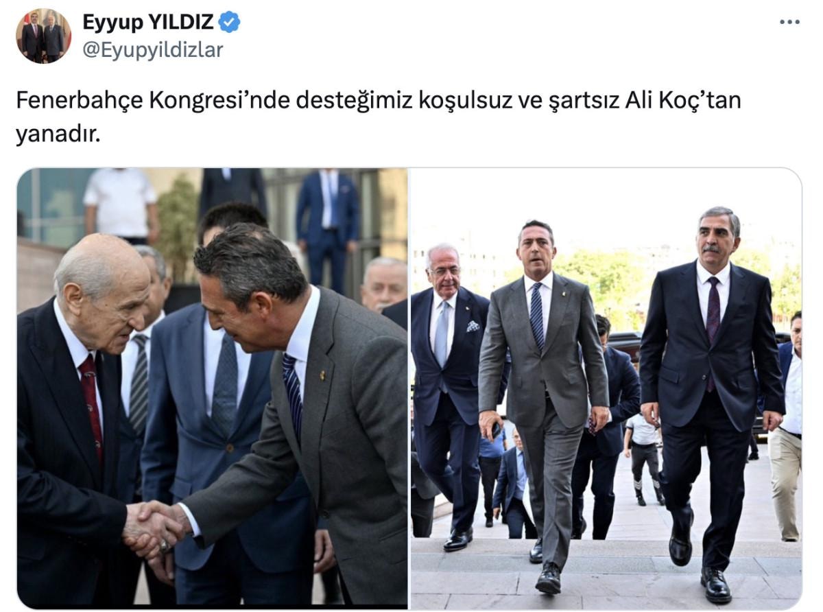 Ali Koç'un MHP Genel Merkezi'nde Devlet Bahçeli'yi ziyaret ettiği fotoğraf karelerini paylaşan MHP Genel Başkan Başdanışmanı Eyyüp Yıldız, "Fenerbahçe Kongresi’nde desteğimiz koşulsuz ve şartsız Ali Koç’tan yanadır." ifadelerine yer verdi.