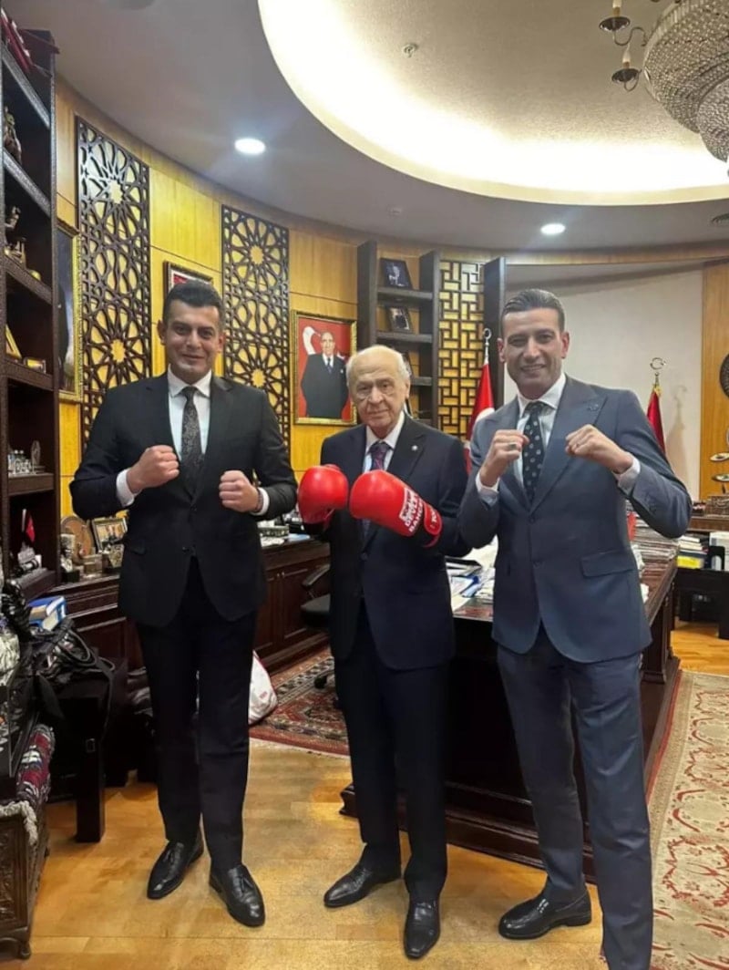 Bahçeli, makamında gerçekleşen ziyarette boks eldiveniyle kameralara poz verdi.