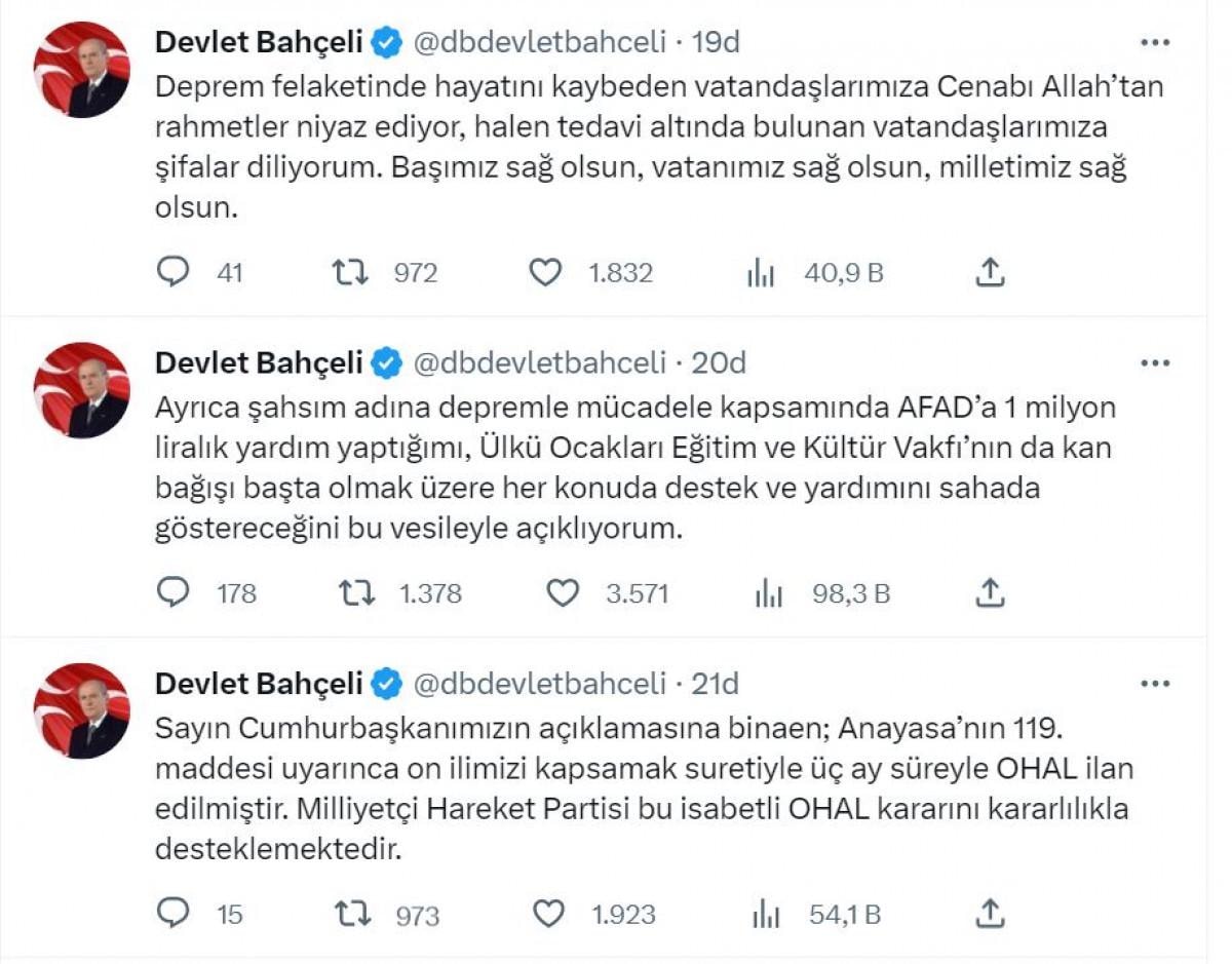 Ayrıca şahsım adına depremle mücadele kapsamında AFAD'a 1 milyon liralık yardım yaptığımı, Ülkü Ocakları Eğitim ve Kültür Vakfı'nın da kan bağışı başta olmak üzere her konuda destek ve yardımını sahada göstereceğini bu vesileyle açıklıyorum. Deprem felaketinde hayatını kaybeden vatandaşlarımıza Cenabı Allah'tan rahmetler niyaz ediyor, halen tedavi altında bulunan vatandaşlarımıza şifalar diliyorum. Başımız sağ olsun, vatanımız sağ olsun, milletimiz sağ olsun.