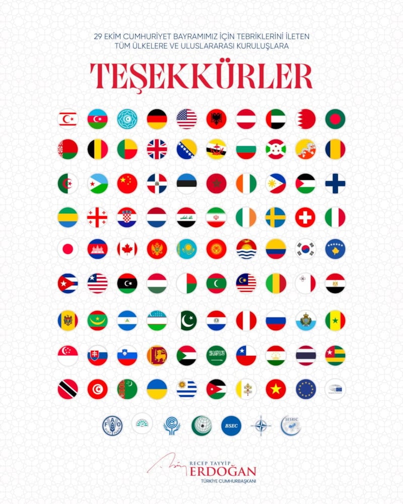 Erdoğan'ın paylaşımında tebriklerini ileten ülkelerin bayrakları ile uluslararası kuruluşların logoları da yer aldı.