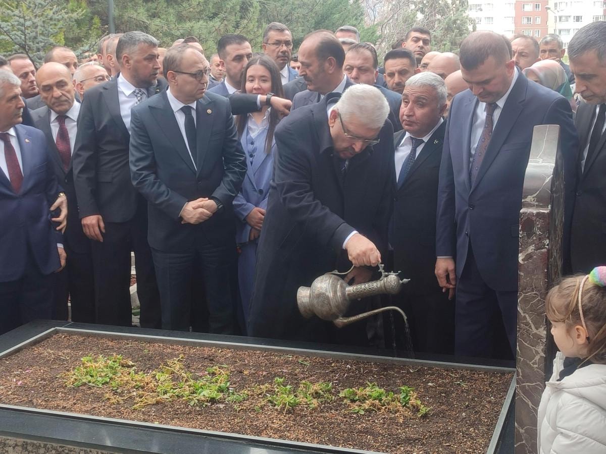 MHP Genel Başkan Yardımcısı Yalçın, partililerle ile birlikte dua ederken Türkeş'in mezarına kırmızı karanfiller bırakıp, su döktü.