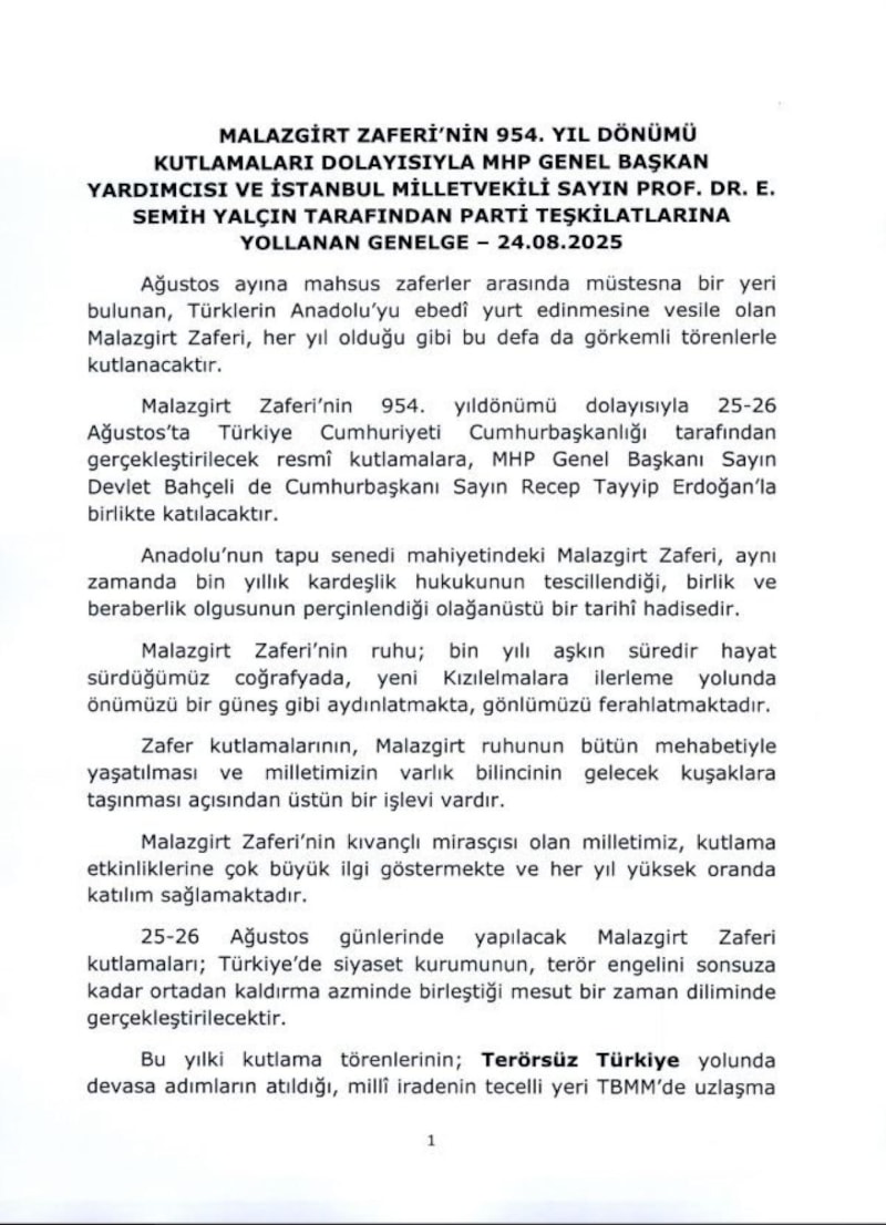 MHP Genel Başkan Yardımcısı ve İstanbul Milletvekili Semih Yalçın, Malazgirt Zaferi’nin 954. yıl dönümü dolayısıyla parti teşkilatlarına bir genelge gönderdi.