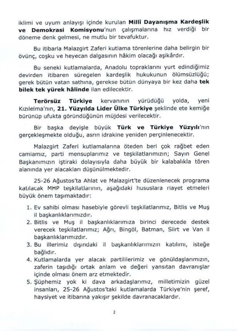 Genelgede, 25-26 Ağustos 2025 tarihlerinde Türkiye Cumhuriyeti Cumhurbaşkanlığı tarafından Ahlat ve Malazgirt’te düzenlenecek resmî kutlamalara, MHP Genel Başkanı Devlet Bahçeli'nin Cumhurbaşkanı Recep Tayyip Erdoğan ile birlikte katılacağı ifade edildi.