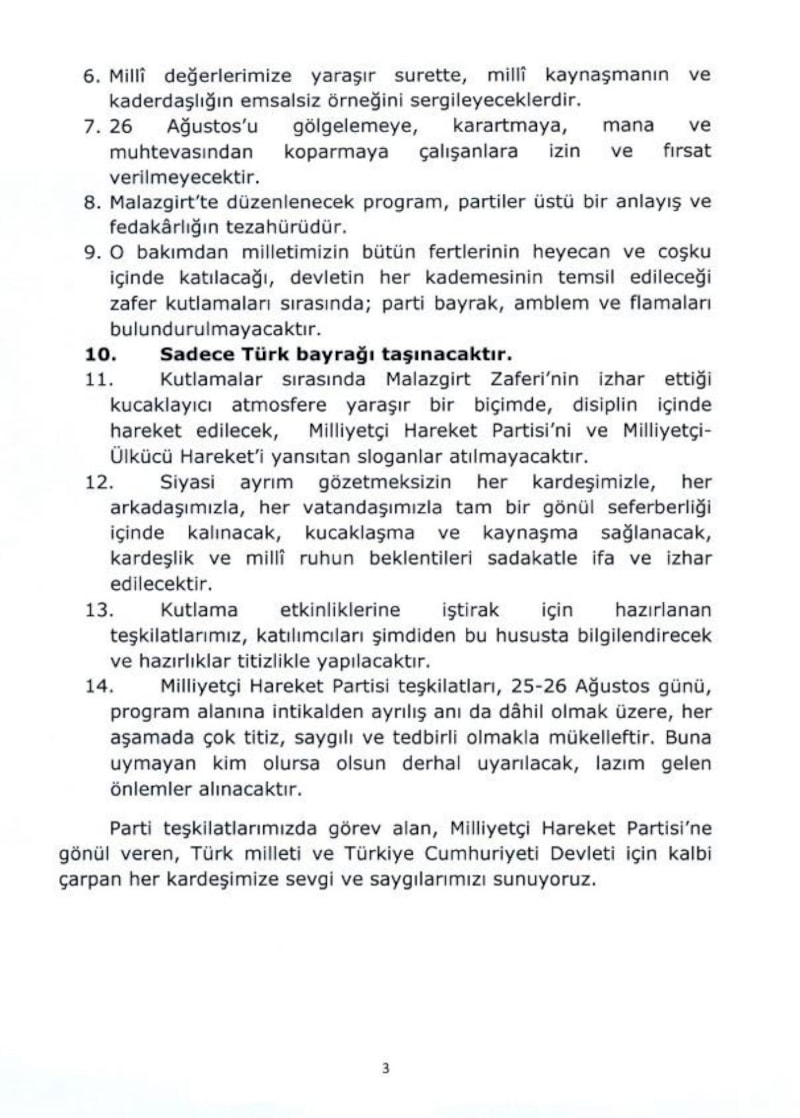 Milliyetçi Hareket Partisi teşkilatları, 25-26 Ağustos günü, program alanına intikalden ayrılış anı da dâhil olmak üzere, her aşamada çok titiz, saygılı ve tedbirli olmakla mükelleftir. Buna uymayan kim olursa olsun derhal uyarılacak, lazım gelen önlemler alınacaktır.”