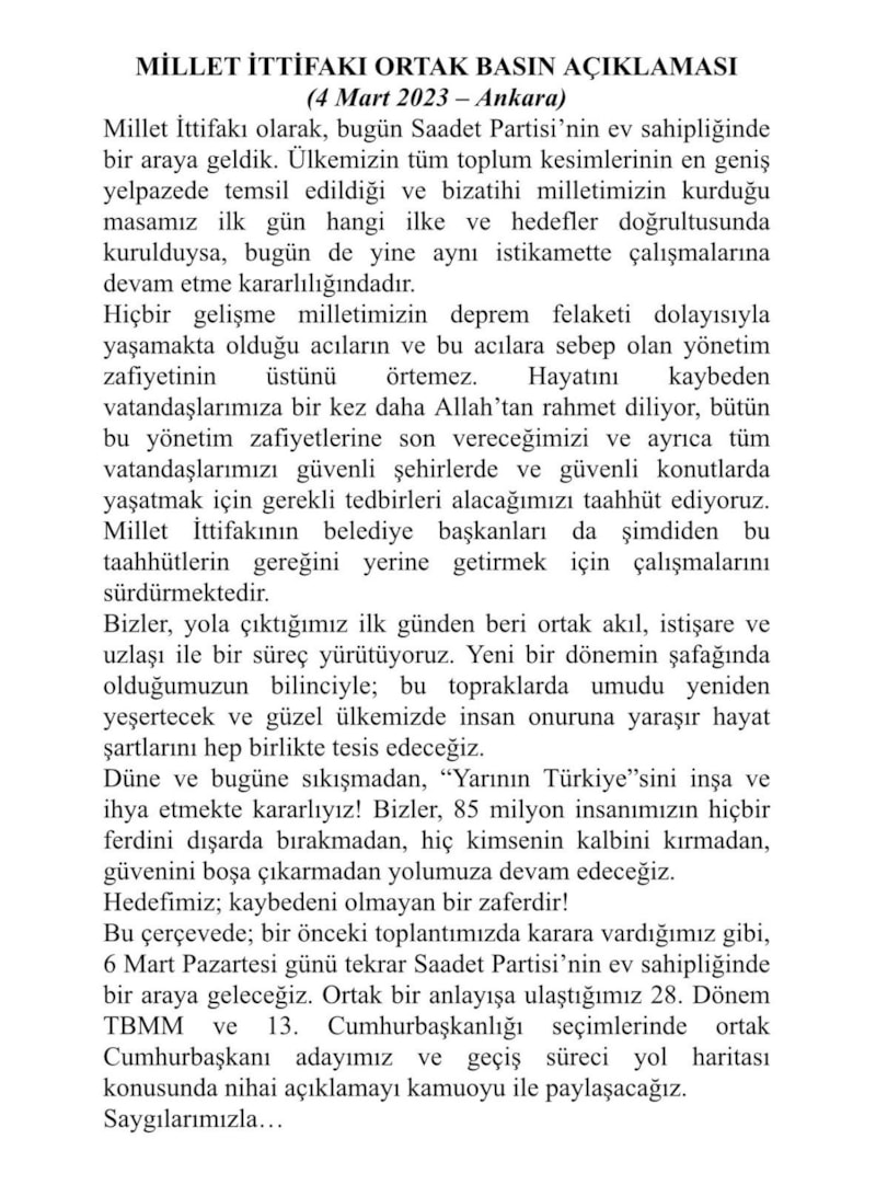 Bu çerçevede; bir önceki toplantımızda karara vardığımız gibi, 6 Mart Pazartesi günü tekrar Saadet Partisi’nin ev sahipliğinde bir araya geleceğiz. Ortak bir anlayışa ulaştığımız 28. Dönem TBMM ve 13. Cumhurbaşkanlığı seçimlerinde ortak Cumhurbaşkanı adayımız ve geçiş süreci yol haritası konusunda nihai açıklamayı kamuoyu ile paylaşacağız.”