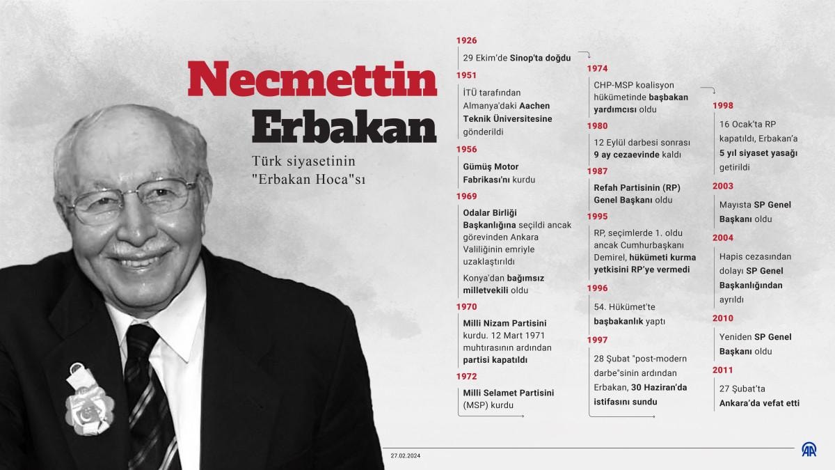 Milli Görüş hareketinin kurucu lideri ve Türk siyasetinde "Erbakan Hoca" olarak anılan eski başbakan Necmettin Erbakan, solunum yetmezliğine bağlı, kalp ve çoklu organ yetmezliği sebebiyle 27 Şubat 2011'de hayatını kaybetti.